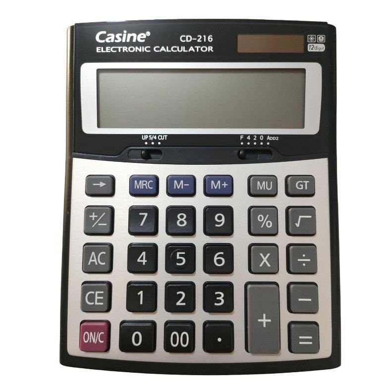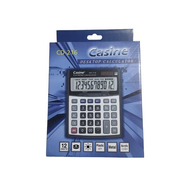آلة حاسبة ( للمكتب ) Casine CD-216 بشاشة كبيرة لعرض 12 رقمًا، تعمل بالطاقة الشمسية والبطارية، و بواجهة معدنية. مع غطاء أكريليك لحماية الشاشة. مناسبة للاستخدام المكتبي.